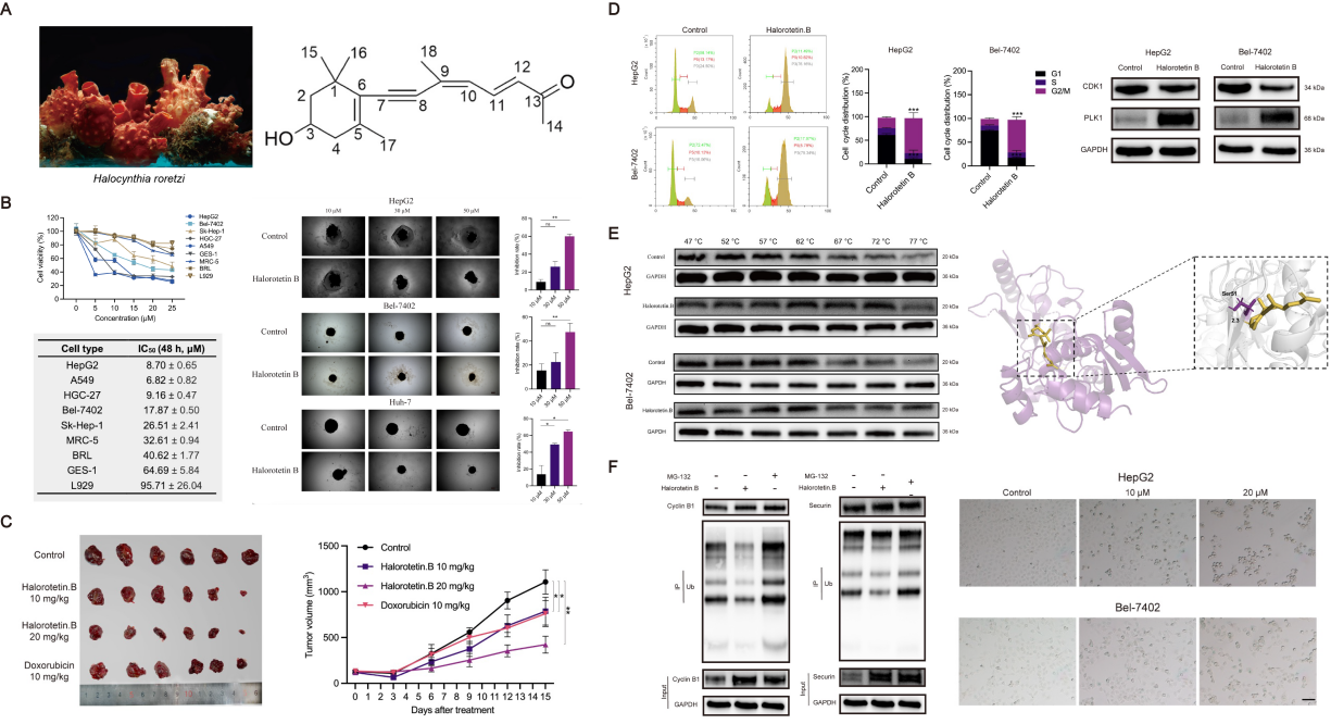 (A) 真海鞘来源的天然抗肿瘤化合物Halorotetin B。(B) Halorotetin B体外抑制肿瘤细胞及肿瘤细胞球增殖。(C) Halorotetin B体内抑制肿瘤生长。(D) Halorotetin B诱导肿瘤细胞周期阻滞。(E) 细胞周期调控蛋白UBE2C为Halorotetin B的直接作用靶点。(F) Halorotetin B通过靶向UBE2C诱导肿瘤细胞周期阻滞及肿瘤细胞衰老。