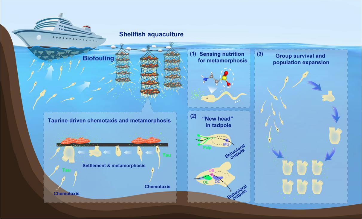 研究团队立足解决港口装备和海水养殖设施上大量入侵污损生物附着问题,从扇贝养殖笼上海鞘高密度附着现象出发寻找解决问题的灵感,提出养殖扇贝中可能存在吸引海鞘幼虫附着的驱化因子的假说。经过系列实验筛选检测,最终鉴定发现扇贝和海鞘组织中含有的牛磺酸是吸引海鞘幼虫的化学诱导分子。进一步的实验表明,牛磺酸分子通过特异性激活海鞘幼虫外周神经系统的乳突感觉神经元,将神经兴奋传递至中枢神经系统,进而导致附着变态等幼虫行为。牛磺酸是一种游离氨基酸,在海洋经济动物如扇贝和牡蛎中含量较高,是陆地生物的几百倍,具有维持机体渗透压平衡、增加神经传导和兴奋等功能,因此也是某些用于提高神经兴奋和抗疲劳功能饮料的重要成分。牛磺酸是第一个鉴定发现的诱导海鞘幼虫附着的环境化学信号分子,这一结果不但解释了海洋污损生物种群高密度附着的现象,而且也为开发靶向化学感知的抗海鞘附着污损技术提供了重要科学基础,为海洋演化发育生态(Eco-Evo-Devo)领域研究提供了新的思路和视角。