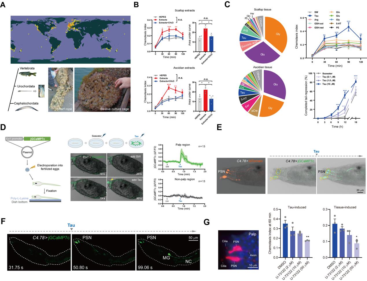 研究团队以近岸典型污损生物萨氏海鞘为模式,系统探究了幼虫化学感知机制在其定居偏好中的作用。通过室内幼虫趋化行为学实验,确定了养殖贝类和成体海鞘组织中含有吸引海鞘幼虫并诱导附着变态的化学物质(图2B)。通过对组织提取物的质谱分析结合趋化行为学筛选,鉴定得到贝类和成体海鞘组织中高含量的牛磺酸(taurine)是海鞘幼虫的化学吸引物和变态诱导剂(图2C)。为了进一步明确幼虫对牛磺酸分子的感知机制,研究人员利用钙离子成像技术,将可在表皮泛表达的jGCaMP7c遗传编码荧光探针转入海鞘受精卵中,待发育至幼虫期后通过牛磺酸刺激,确定了幼虫躯干前端乳突结构中的特定细胞类型可直接响应刺激(图2D)。通过对乳突中三种不同细胞类型的分析筛查,研究人员确定了PSN神经元可直接感知牛磺酸(图2E),并将神经兴奋传递至幼虫中枢神经系统的运动神经节和背神经索(图2F);从化学感知到幼虫行为输出这一过程依赖于神经肽-促性腺激素释放激素(GnRH)信号得以实现(图2G)。