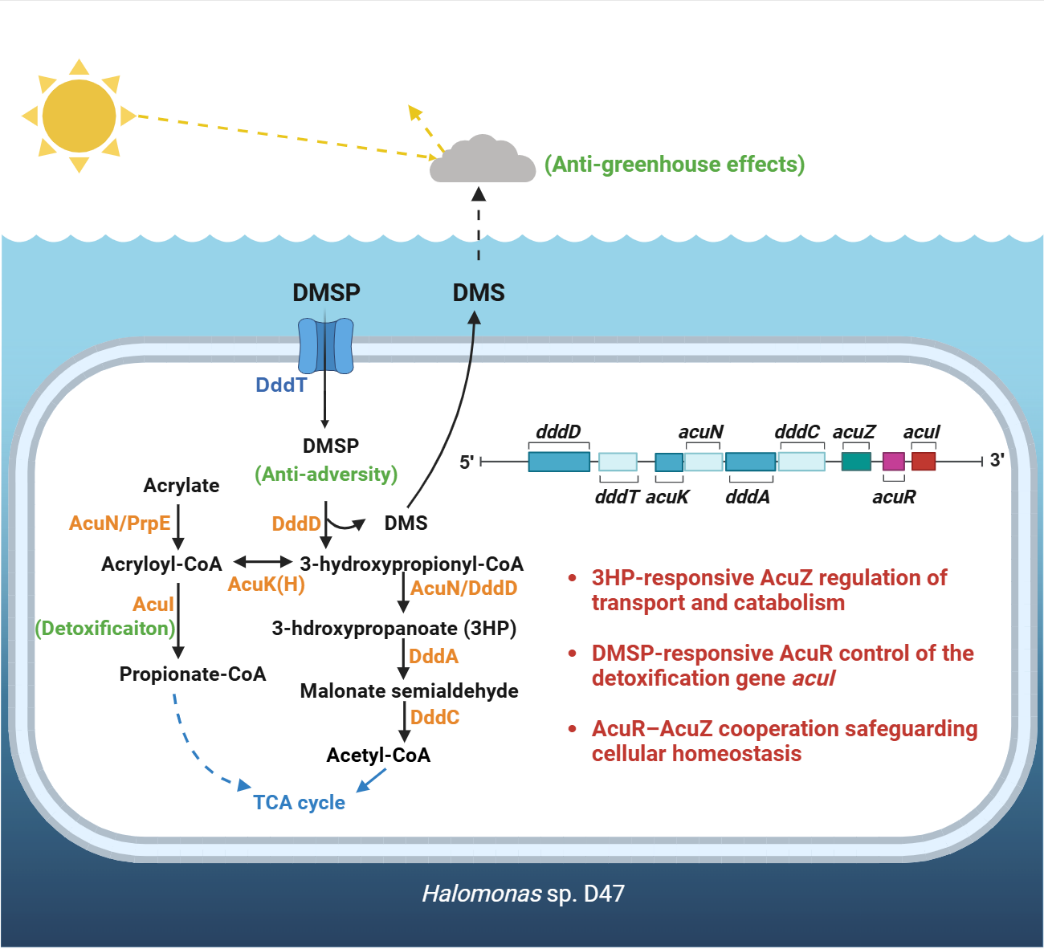 二甲基巯基丙酸(Dimethylsulfoniopropionate, DMSP)是海洋中最丰富的有机硫化合物之一。微生物裂解DMSP会产生二甲基硫(Dimethyl sulfide, DMS)。DMS既是海洋硫库、大气硫库和陆地硫库交换的重要媒介又是重要的“冷室气体”。因此,DMSP的微生物代谢不仅是微生物生理代谢问题更是全球硫循环与气候调节的重要过程。相较于其他DMSP代谢菌株,携带dddD基因的γ-变形杆菌,其DMSP代谢相关基因通常聚簇排列,并表现出更高效的代谢能力。然而,DMSP裂解产生的中间产物acryloyl-CoA具有显著毒性,如何在高效利用DMSP的同时避免“代谢中毒”是一个重要的科学问题。