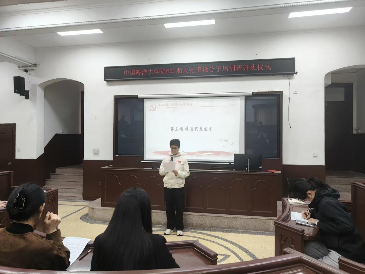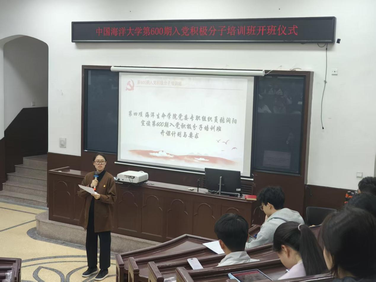 4月9日,中国海洋大学第600期入党积极分子培训班开班仪式在鱼山校区科学馆K111教室举行。医药学院党委专职组织员王晓菲,海洋生命学院党委专职组织员张润阳、辅导员谷慧文出席开班仪式,仪式由海洋生命学院2023级生物科学(拔尖计划)班冯竞逸主持,培训班全体学员参加。